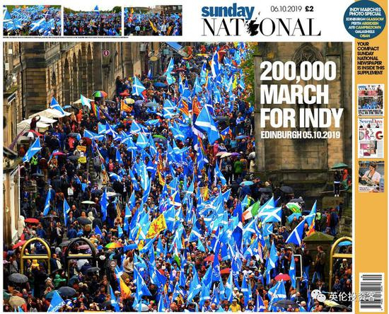 2019年10月5日,超过20万支持苏格兰独立的民众走上爱丁堡街头,举行示威游行。