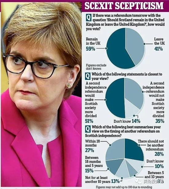 民调公司还用刚刚出炉的数据对比了2014年苏格兰独立公投的结果(留英:55.30%,独立:44.70%)。