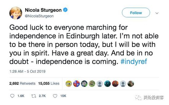 苏格兰首席大臣、SNP党魁尼古拉·斯特金(Nicola Sturgeon)也在推特上表达了对游行民众的支持,她表示:“别怀疑,独立即将来临。”