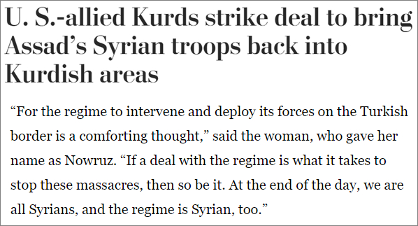 被美军“守护神”抛弃,向谁求助?一名接受《华盛顿邮报》采访的库尔德女子说:“如果与阿萨德政权的协议能够阻止这些屠杀(土耳其的军事行动),那就这样吧。我们和阿萨德终归都是叙利亚人。”毕竟都是叙利亚人,叙利亚政府不伸出援手也讲不过去。▼