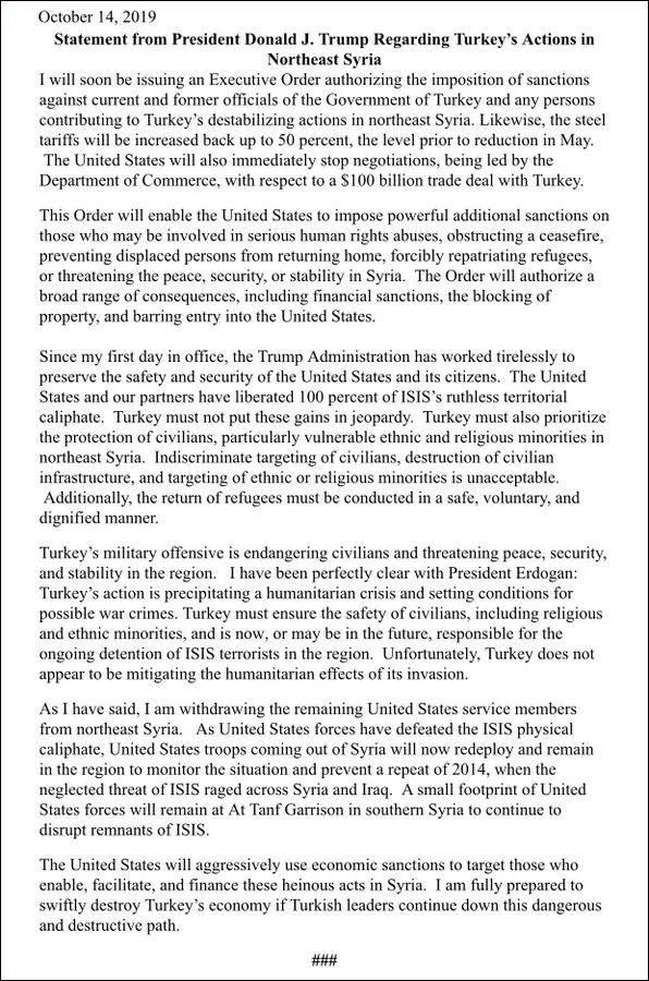 当地时间14日下午,美国财政部长姆努钦和副总统彭斯在白宫外宣布,总统特朗普签署行政命令,正式对土耳其实施制裁。
