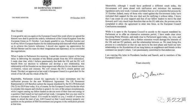 根据英国议会通过的一项法律,约翰逊必须向欧盟写信,要求将脱欧期限从10月31日推迟至2020年1月31日。约翰逊向欧洲理事会主席图斯克致函要求延期脱欧,但却故意没有签字。