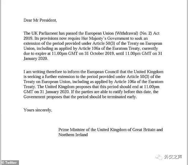 同时,他还向欧盟发出了另一封签名的信函,表示希望欧盟不要同意延期。