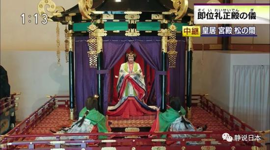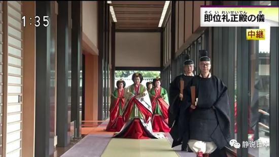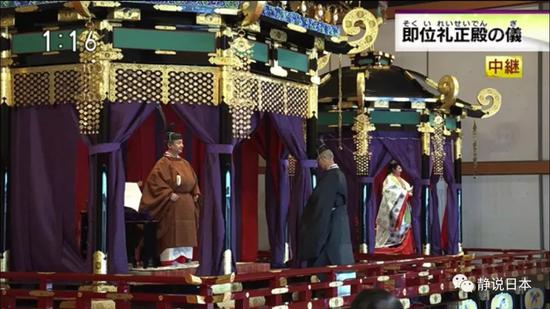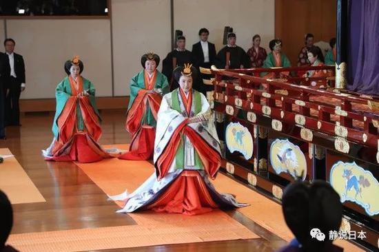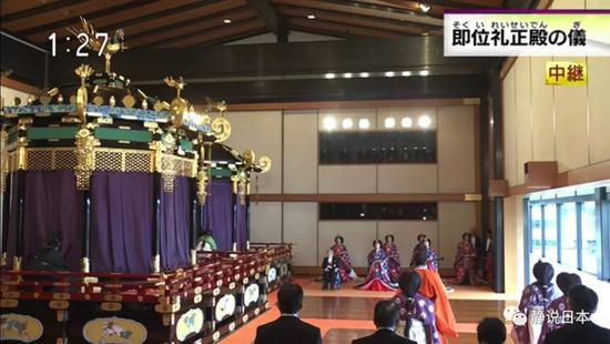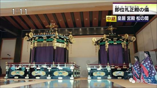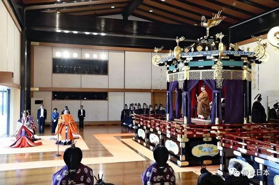 日本宫内厅说,这所有的仪式,源自于奈良时代(710—794),服饰发饰也遵循1300年前的样式。而天皇与皇后即位用的“高御座”,是大正天皇即位时的物品,已经供大正、昭和、平成三代天皇使用,平时藏于京都的御所,这次从京都分乘8台大卡车运到东京,在皇宫里重新搭建而成。