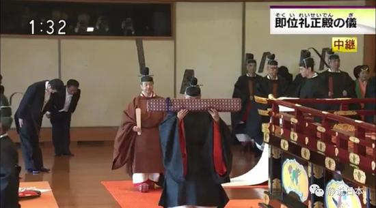 确实,宫内厅临时调整了仪式,将原本要在皇宫大殿“松间”外的庭院里举行的象征皇权的宝剑与勾玉的奉纳仪式,也移到了“松间”的内室。即位仪式是在下午13时(北京时间12时)开始举行。没有想到,即位仪式开始前10分钟,雨渐渐地停了,天空中居然出现了太阳,阳光照射到了“松间”,让大家十分诧异。