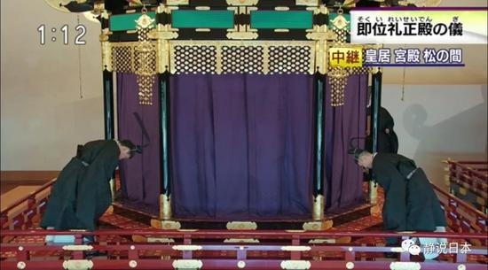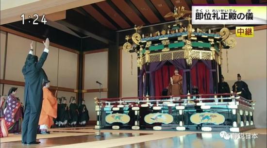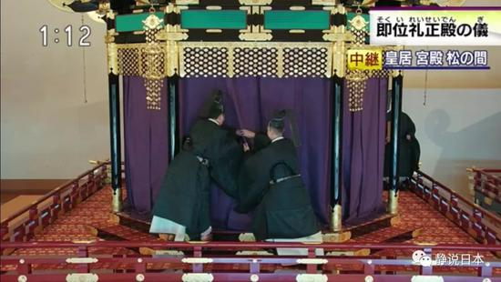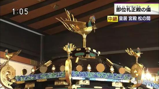 在日本的神道传说中,天皇是太阳神之子。在子孙登基即位时,太阳神似乎一直呵护加持,为德仁天皇拨开乌云。奇怪的还有,等半个小时仪式结束后,东京上空又盖上了乌云。即位仪式是日本“改朝换代”的最重要的仪式,这一仪式的核心,是天皇要亲口向海内外宣告:“我当天皇了”。但是,这一宣告不是对着麦克风喊上一句,而是要举行一个传统的即位仪式。这个传统的即位仪式有多传统呢?首先,天皇要站在一个有特别门帘遮挡的宝座上,与国民和海外嘉宾见面。这个宝座叫“高御座”,高6.5米,顶上与四面,均为纯金凤凰。