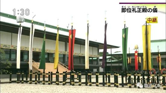 再其次,在“松间”外的庭院里,要插上各有象征的7色幡旗,共22根,高度均为9米,其中最关键的是三面,一面是太阳幡,一面是月亮幡,还有一面是“万岁”幡。这“万岁”两个字,是安倍首相所写,用金线绣到幡上的。是安倍首相代表国民所写,还是利用特权所书,下次遇到安倍首相,得好好问问。