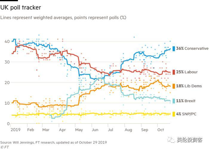 *2019年10月29日出炉的最新民调显示,保守党以36%的支持率领先,工党和自民党紧随其后,分别是25%和18%。