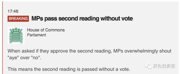 但罕见的是,英国议会今天以惊人的速度,在一个晚上通过了《选举法案》二读和三读。1。 二读,今天的立法二读没有正式投票,议员们用“喊叫”的方式,以压倒性多数的“赞成(aye)”盖过了“不(no)”,直接通过了二读环节。