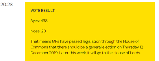 国会议员们以438票对20票赞成了鲍里斯·约翰逊(Boris Johnson)于12月12日举行大选的提案。