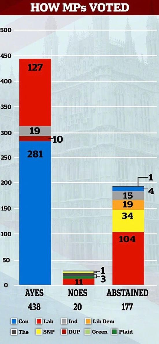 而这次因为得到了科尔宾,SNP和LibDem等反对党的支持,动议以438支持票,对20反对票,得到了压倒性胜出!