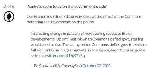 英镑的走势站在鲍里斯政府这一边。他们发现,当鲍里斯战胜议会的时候,英镑就会涨,而当议会控制脱欧局面时,英镑则会跌。