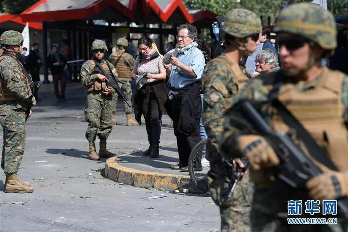 智利国防部长称,鉴于抢劫现象严重,军方决定从20日起向圣地亚哥增派1500名士兵维持社会秩序。身着迷彩服的士兵出现在大街上,这是智利自1990年皮诺切特军事统治结束以来,首次出现类似场景。
