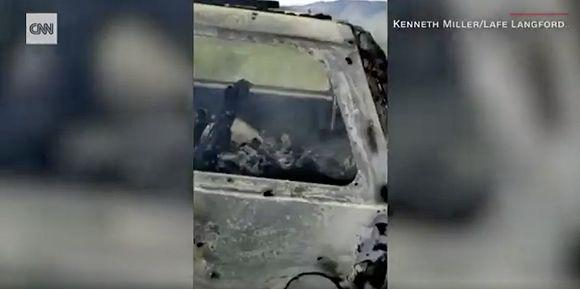 事故现场,其中一辆已经烧毁的越野车。图片来源:CNN视频截图