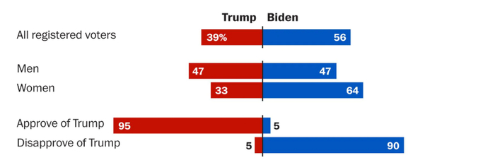 特朗普在共和党选民中的支持率也有所下降,为80%,而2016年的民调支持率为88%。