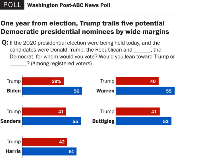 在距离2020年美国总统大选还有一年之时,《华盛顿邮报》和美国广播公司的一项联合民调显示,现任总统特朗普的支持率已落后于其民主党主要竞争对手,包括桑德斯、沃伦和拜登。