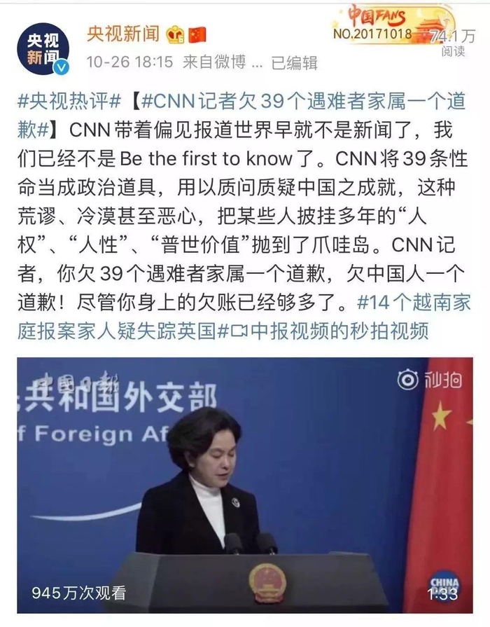 更可气的是,10月25日,在外交部发言人华春莹主持的外交部例行记者会上,来自CNN的美国记者更是居心叵测,提出了极其不合时宜的问题。
