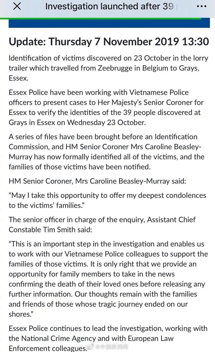 据路透社报道,根据英国警方和越南警方的配合调查,已经可以确认39具尸体全部是越南公民。