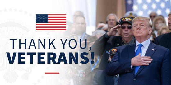 特朗普在推特上写道:“今天,我们作为一个国家欢聚一堂,向美国退伍军人致敬,他们是地球上有史以来最伟大的战士。我们的退伍军人为我们冒了一切风险。现在,我们的责任是服务和保护他们的每一天!”