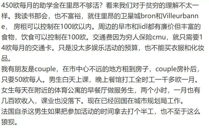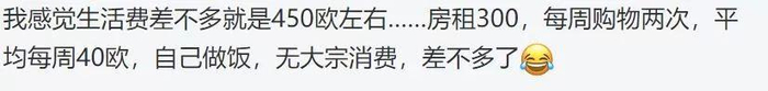 中国不少网友对此也发表自己看法。不少人觉得每月450欧元的确不够花: