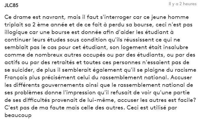里昂二大的教师Bastien Pereira Besteiro表示,“这是许多学生都遭遇过的困难……它也可能发生在其他人身上”“发生了这么极端的事情才能让外界听到声音,这太不正常,公权力机关必须承担起自己的责任。”
