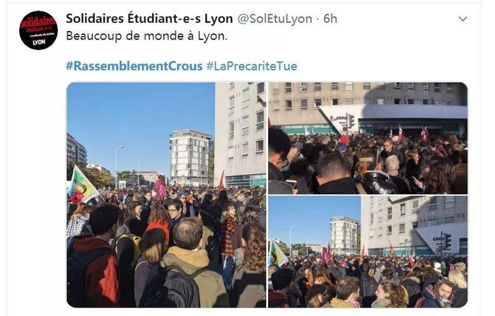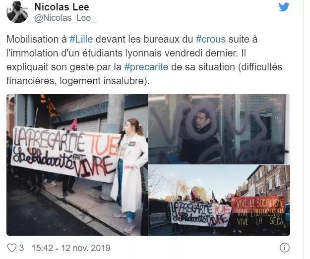 11月8日,里昂发生一起学生自焚事件,疑因经济困窘而导致。12日上午,当事人仍然生命垂危,数百名大学生在事发现场举行示威,抗议学生贫困现象。