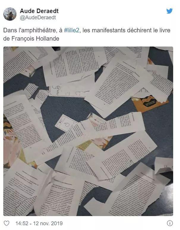 12日,在里尔二大阶梯教室,有示威者手撕前总统奥朗德著作。