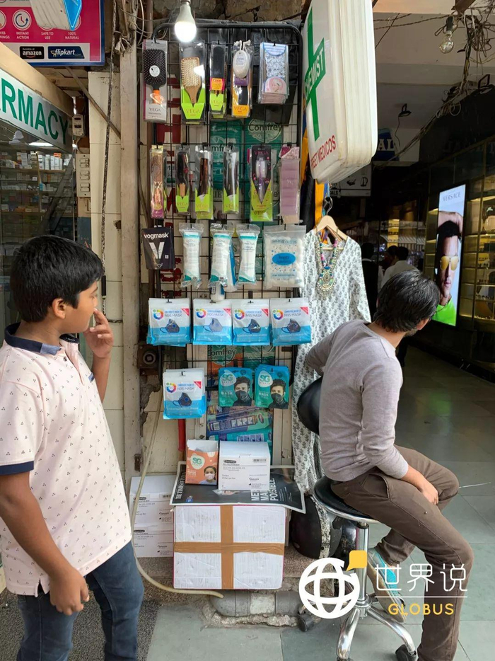 ●新德里一处高端购物街的药店在摆卖防霾口罩 / 世界说