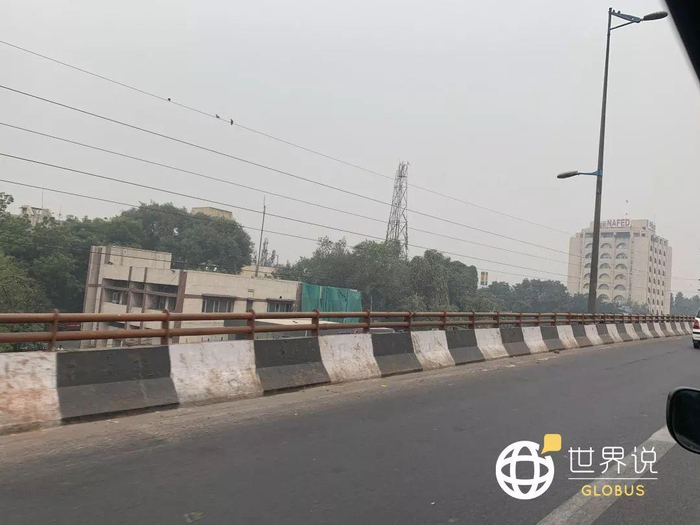 当天德里预报有小雨,但湿润的空气反而加重了雾霾。打了车行驶在高架桥上可以看见,整个城市像是被包裹在大雾之中。远远看去,这片白茫茫的雾气泛着土黄色,能见度恐怕不足百米。