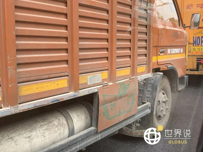 ●印度德里,一辆卡车的侧面标着“CNG”(压缩天然气)的标志 / 世界说