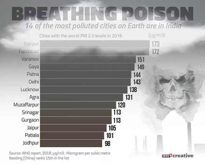 ●世界上空气污染最严重的14个城市均位于印度,数据来源:世界卫生组织 / News 18