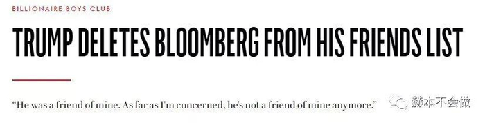 布隆伯格与特朗普认识几十年,两人曾一起打高球。但2016年2月,特朗普突然宣布,他已经将布隆伯格从朋友名单里删除。原话是这么说的: