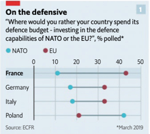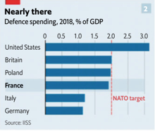 但欧洲真的准备好进行这样的转变了吗?外交关系委员会的菲利普•戈登(Philip Gordon)叹息道:“我很久以来一直在听说欧洲的战略自主权了。”戈登曾是巴拉克•奥巴马的顾问。部分问题出在国防开支上(见上一页图表2)。如果欧洲的北约成员国要兑现到2024年将GDP的2%用于国防的承诺,这将意味着额外支出1020亿美元——比目前多40%。