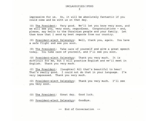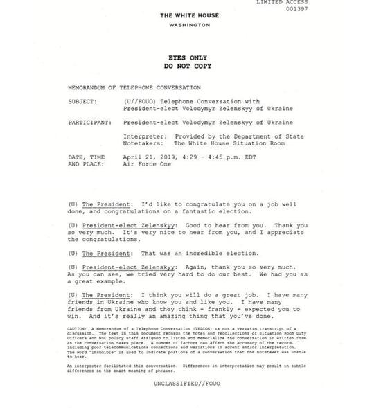 泽连斯基: 是的,你刚才说的一切对我也非常重要。作为总统我们我们应该对一切未来的合作保持开放态度。我们已经准备好在美乌合作的的历史上书写新的篇章。我已经召回了我们现任的驻美大使。新任大使将会是一个非常有能力有经验的人。我相信新任大使可以促进美乌关系进一步发展。我也衷心希望新任大使能赢得您的信任,从而助力两国的合作。我还要亲自告诉您,我的助手刚刚和朱利亚尼先生通了电话。我们准备邀请朱利亚尼来访乌克兰与我见面。我想要再次向您保证我身边的都是您可以相信的人。我会在我身边组织起一个有经验和能力的团队。我还想向您重申我们是好朋友。我们希望您的朋友能遍布乌克兰,以此来深化两国的战略合作关系。我的团队会十分优秀。作为乌克兰总统,我向您保证,包括我们提到的调查之内的所有调查都会公开公正地完成。这点我可以向您保证。