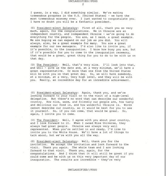 特朗普:你一定会是一个好的总统。我的许多乌克兰朋友都知道你并且支持你。我的乌克兰朋友很多,他们都觉得你一定会赢。你做得太漂亮了。从某个意义上来说,我这边也进展不错。我们美国这边的形势一片大好 – 我们的经济形势达到了史上最佳。我衷心祝贺你,我完全相信你会成为一个很好的总统。