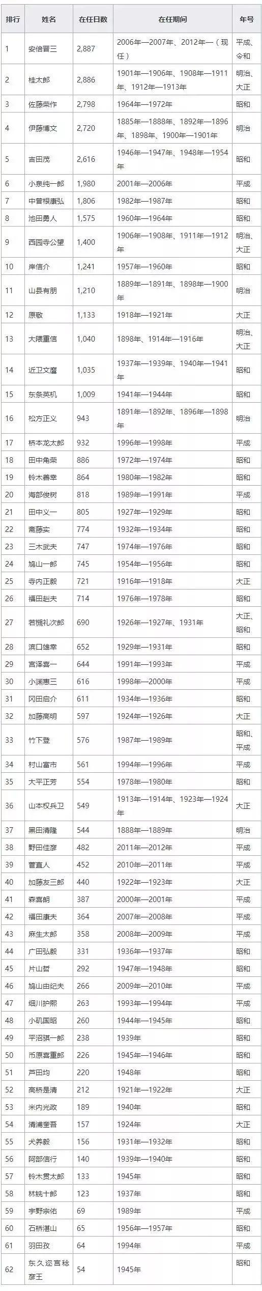 日本内阁总理大臣在任时间排行