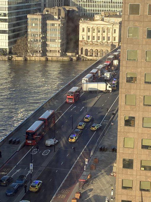 伦敦警方发推文称:“下午1时58分,警察接到报警称伦敦桥附近发生持刀袭击事件。包括伦敦警察厅警官在内的紧急部门出动。一名男子被警方拘留。我们相信有多人受伤。”