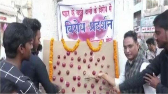 印度多地爆发抗议活动,要求政府采取措施控制洋葱价格。一些买不到洋葱的民众只好“求”洋葱——他们给洋葱带上花环,以此表示不满。