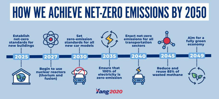 自由红利、全民医疗保险、“以人为本”的资本主义是杨安泽的三大施政主张。此外,在气候治理方面,杨安泽也十分重视,不仅提出修改宪法以赋予美国联邦政府和各州保护环境的责任,让美国成为全球气候治理的领导者,还构思了一系列具体措施,如核能的使用、碳税的征收等,并且制定了一个实现零排放的时间表。