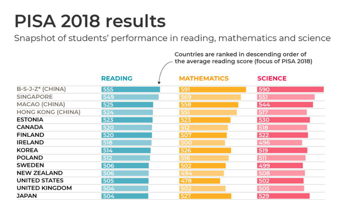 12月3日,经济合作与发展组织(OECD)公布2018年国际学生评估(PISA)调查结果,包括阅读、数学和科学三项测试,中国内地学生在这三方面的表现位列全球第一。
