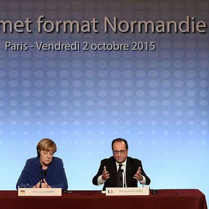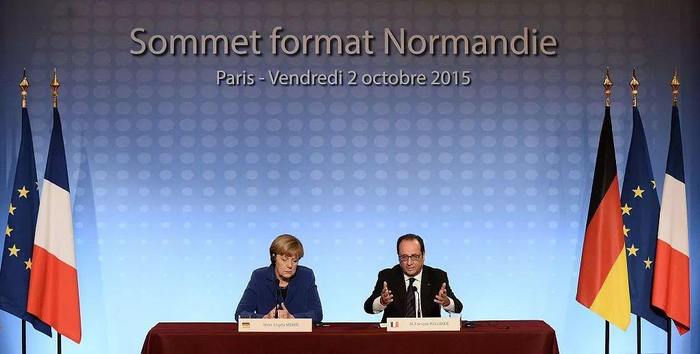 当地时间2015年10月2日,“诺曼底模式”四国峰会在巴黎举行,德国总理默克尔和法国时任总统奥朗德举行联合新闻发布会。/视觉中国