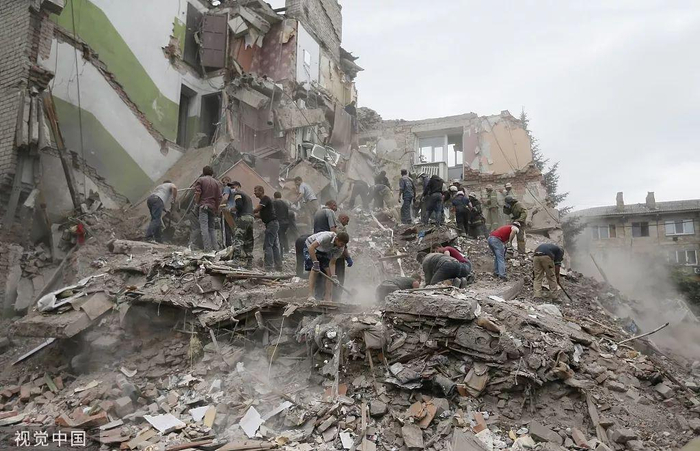 当地时间2014年7月15日,乌克兰顿涅茨克地区一个小镇遭空袭。/视觉中国