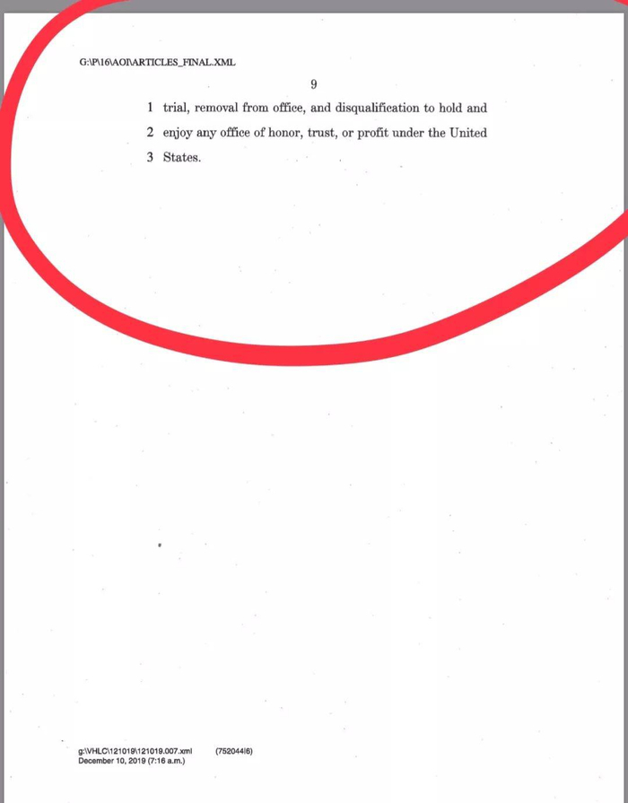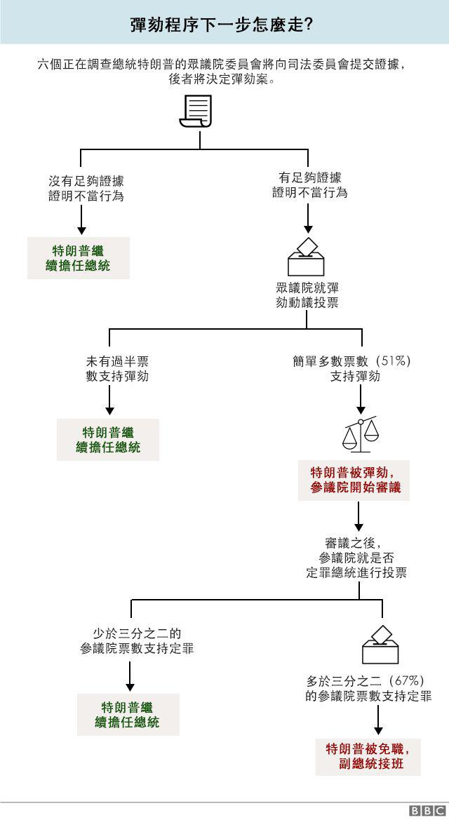 参议院审议:在短暂的圣诞新年假日后,弹劾案将在明年一月送至参议院进行审议。共和党人在此有53比47的席次优势,免去总统职位需要参议院三分之二多数票,即至少要有20位共和党人“叛变”,特朗普才会被褫夺总统一职。