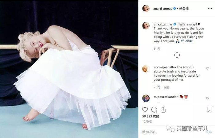 刚拍完这部电影杀青的时候,安娜还在Ins上发了一张梦露的照片,“谢谢玛丽莲·梦露,谢谢你让我做到了,并陪着我们走完每一步。”