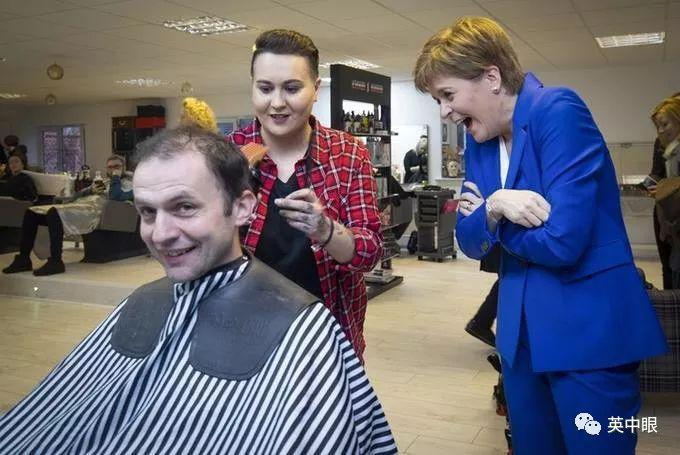 尝试给她的政党候选人斯蒂芬·盖廷理发,吃惊的表情不知是不是因为理坏了。