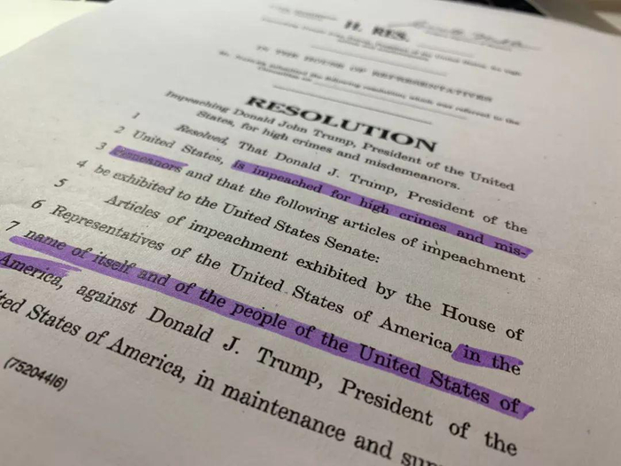 民主党这份决议,上来不痛不痒,说“因总统有重罪与轻罪对其进行弹劾”,到第二段才带了一句“以众议院和人民的名义”递交此弹劾决议。
