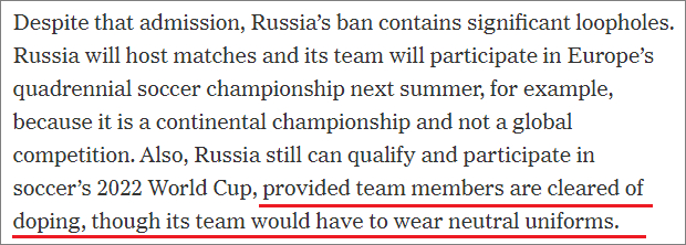 不过,美国方面却希望加强对俄罗斯的处罚,甚至希望所有俄罗斯运动员都该被禁止参赛,不能以中立运动员身份参赛。《纽约时报》就主张把俄罗斯运动员全部逐出奥运赛场,哪怕他们身着中立服装,哪怕通过了WADA的审核。