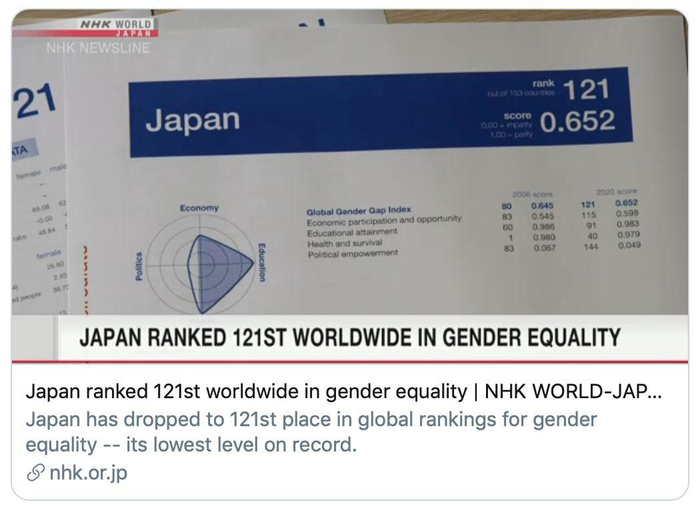 CNN指出,东亚几国的性别差距令人担忧。在性别平等排名中,日本排在第121位,比去年降了11位,创下历史新低;韩国排在第108位;中国排在第106位。