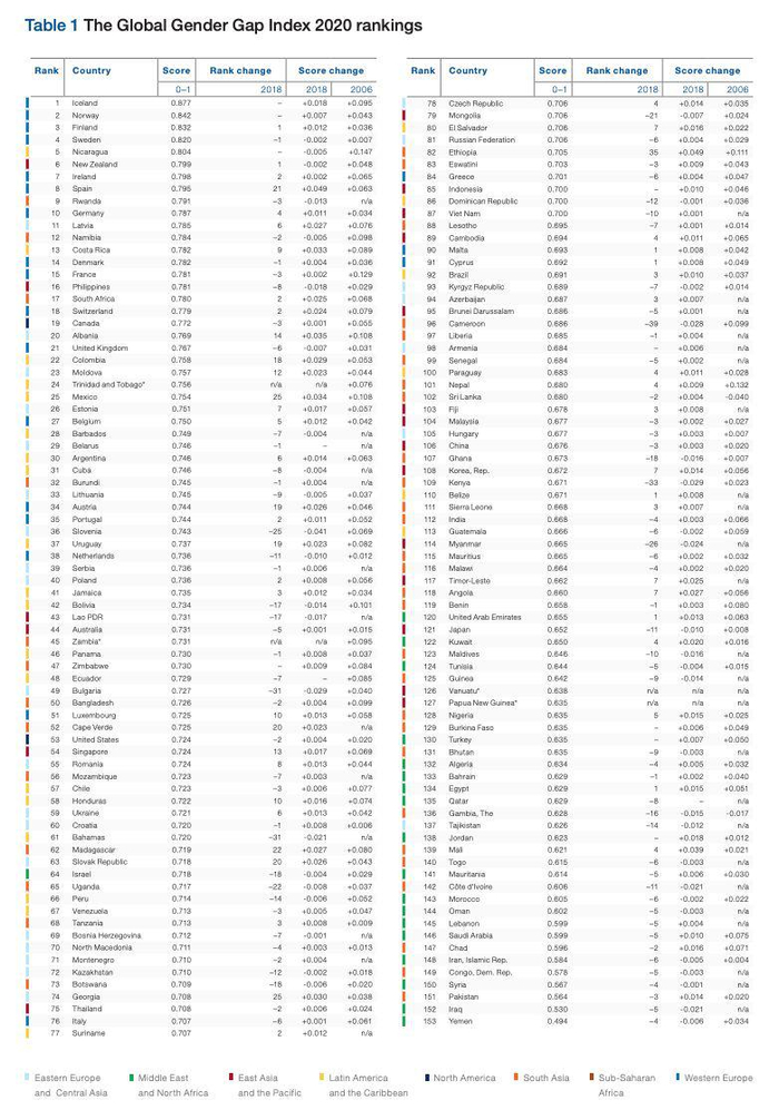 全球性别平等情况排名。