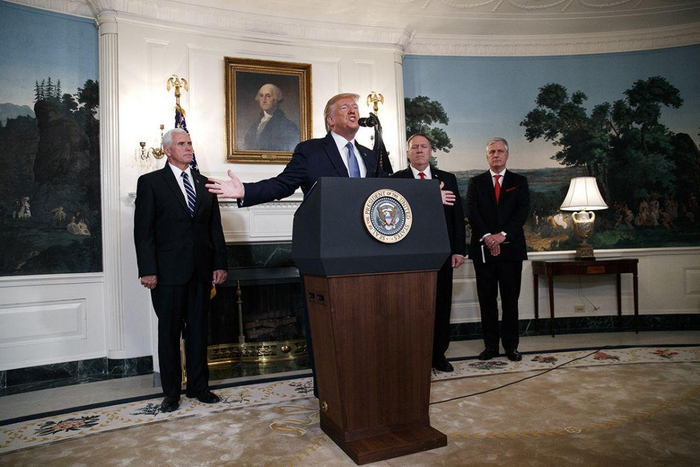 唐纳德·特朗普总统在白宫外交厅发表讲话,副总统迈克·彭斯(左)、国务卿迈克·蓬佩奥(右中)和国家安全顾问罗伯特·奥布莱恩也参加了讲话。